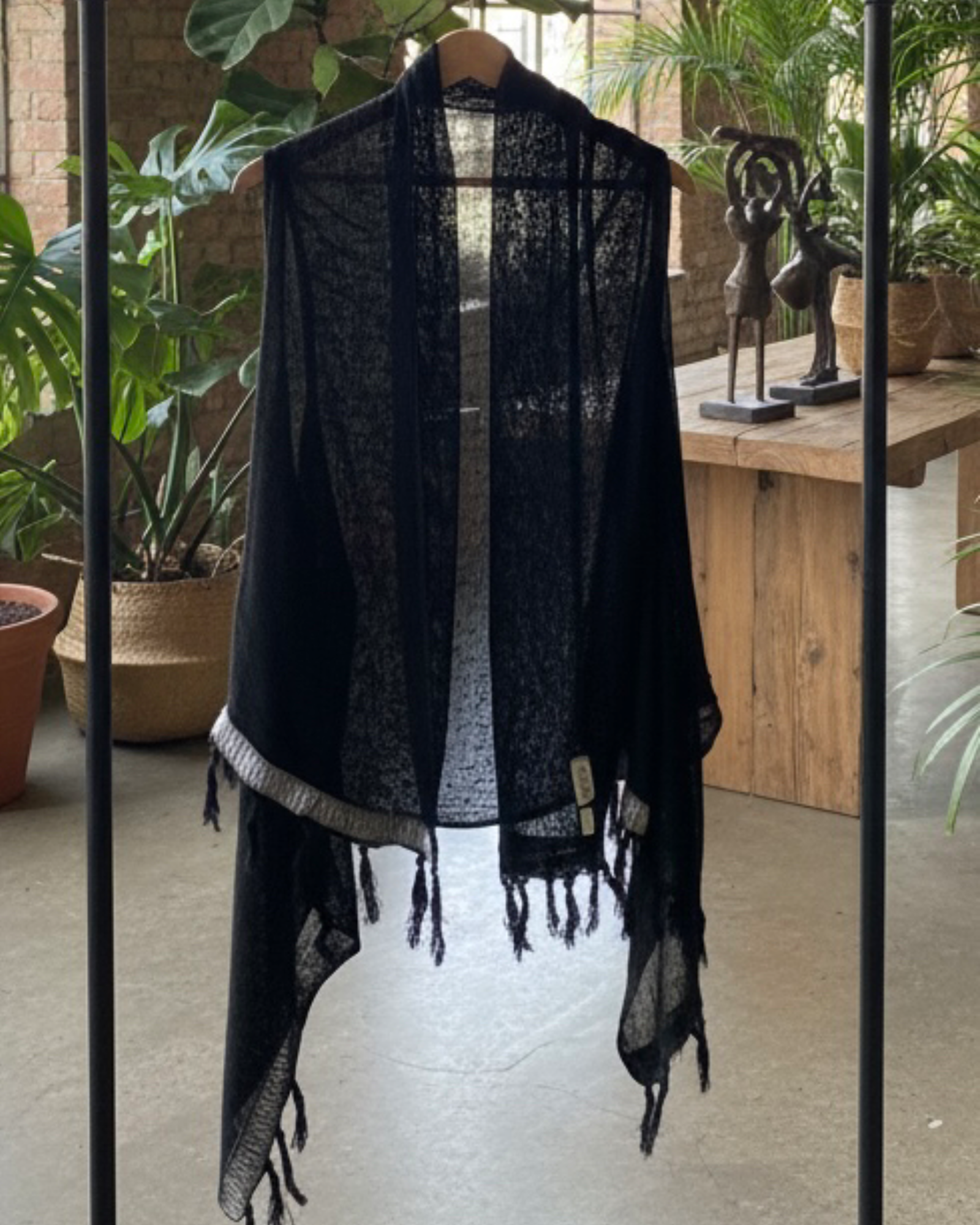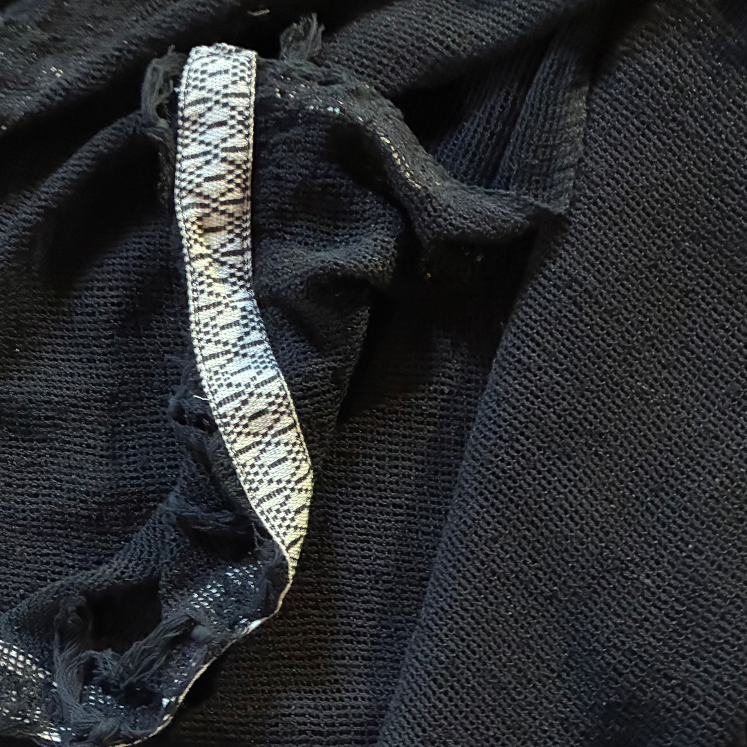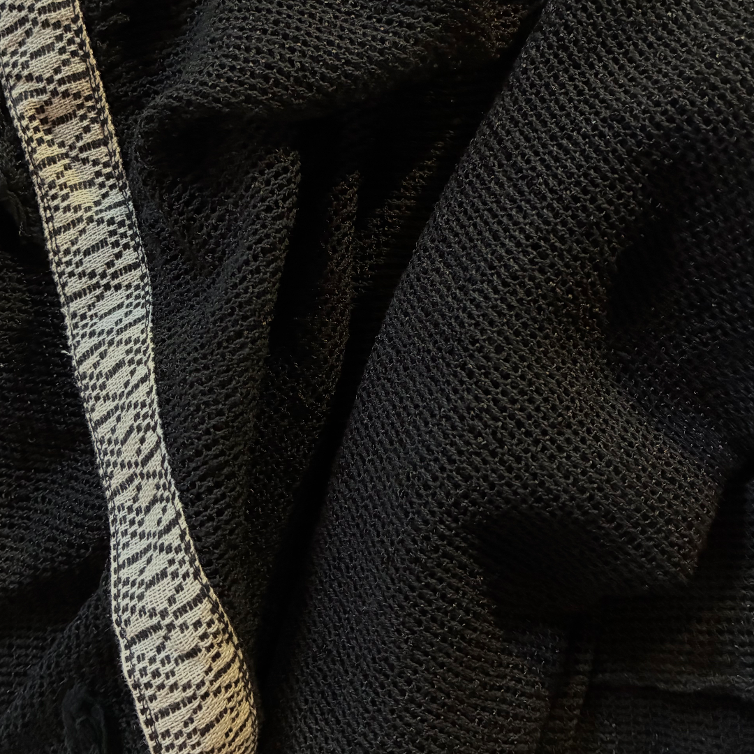 Il dettaglio della fascia conferisce movimento e autenticità al capo, esaltando la texture grezza del tessuto