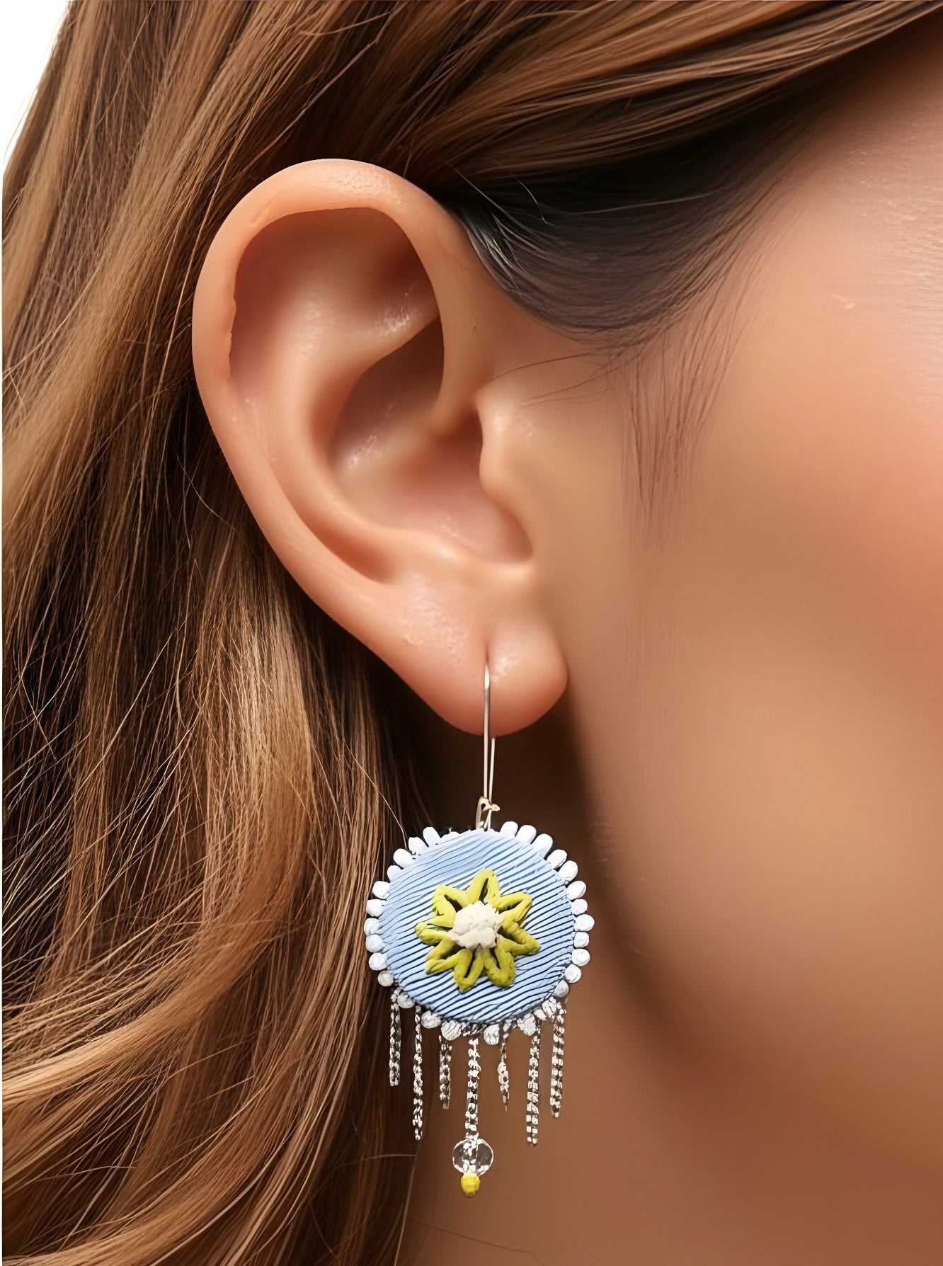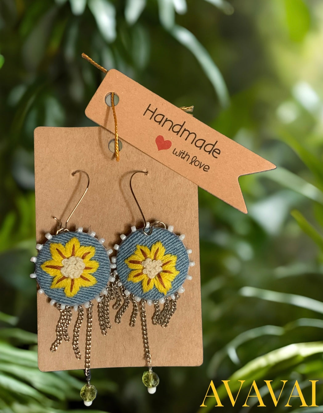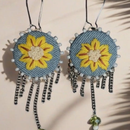 Light Blue Denim & Sunflowers 🌻 Orecchini Pendenti ricamati a mano